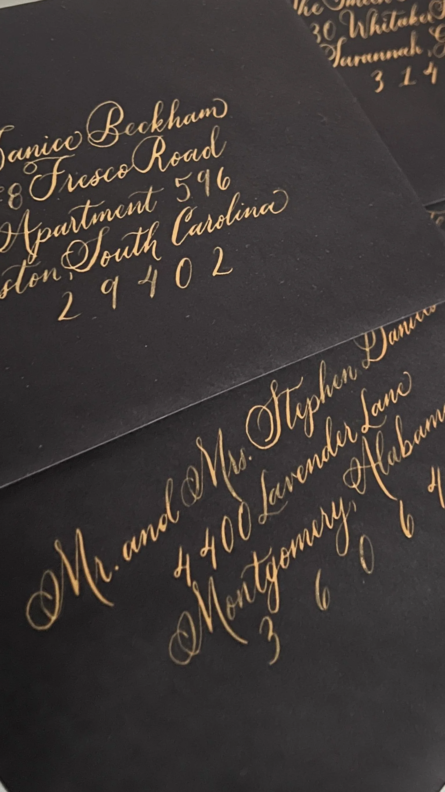 Discover Swish Calligraphy’s bespoke services, including elegant custom calligraphy, luxurious wedding and event invitations, and professional envelope addressing. Create unforgettable details for your special event with exquisite and personalized designs.